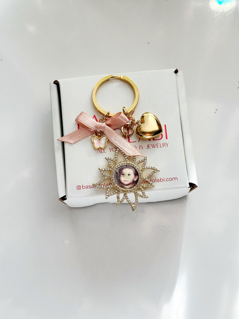 Fotoğraflı Kristal Taşlı Güneş Kalp Ve Kurdele Detaylı Kelebek Anahtarlık