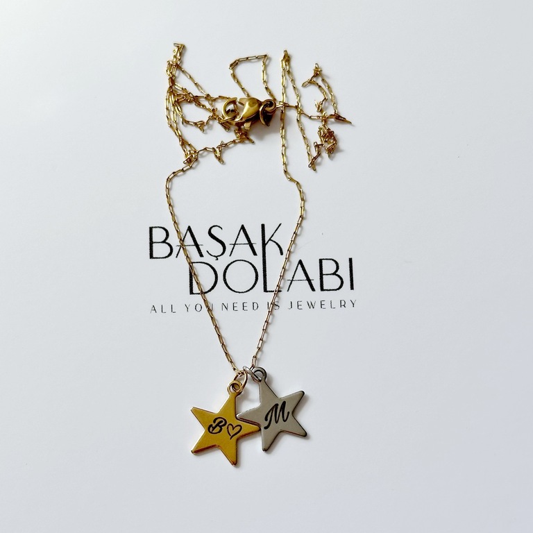Harf Detaylı İki Yıldız Plakalı Çelik Kolye
