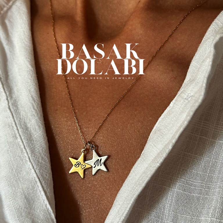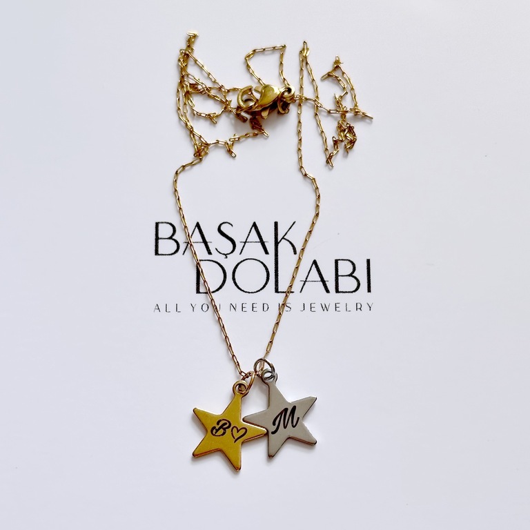 Harf Detaylı İkili Yıldız Plakalı Çelik Kolye