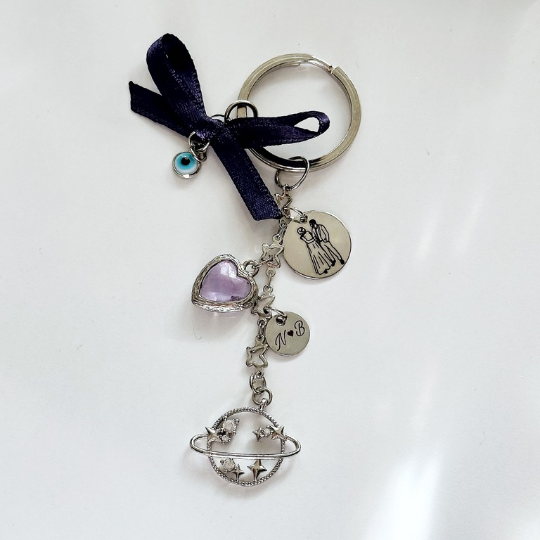 Portre Harf Nazar Boncuğu ve Lila Kalp Kurdele Detaylı Kelebek Zincir Anahtarlık