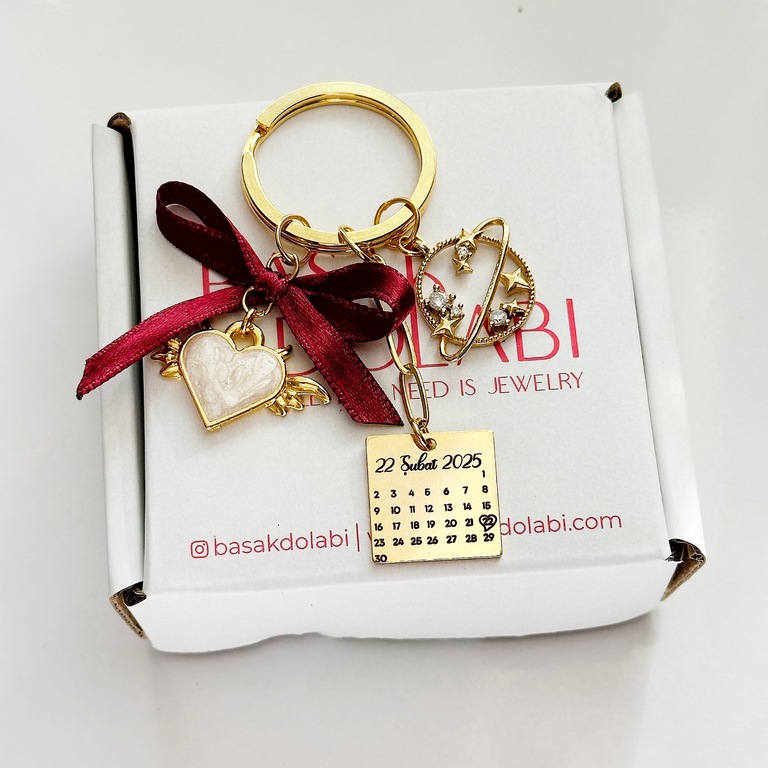 Takvim Kristal Taşlı Satürn Kanatlı Kalp ve Kurdele Detaylı Anahtarlık